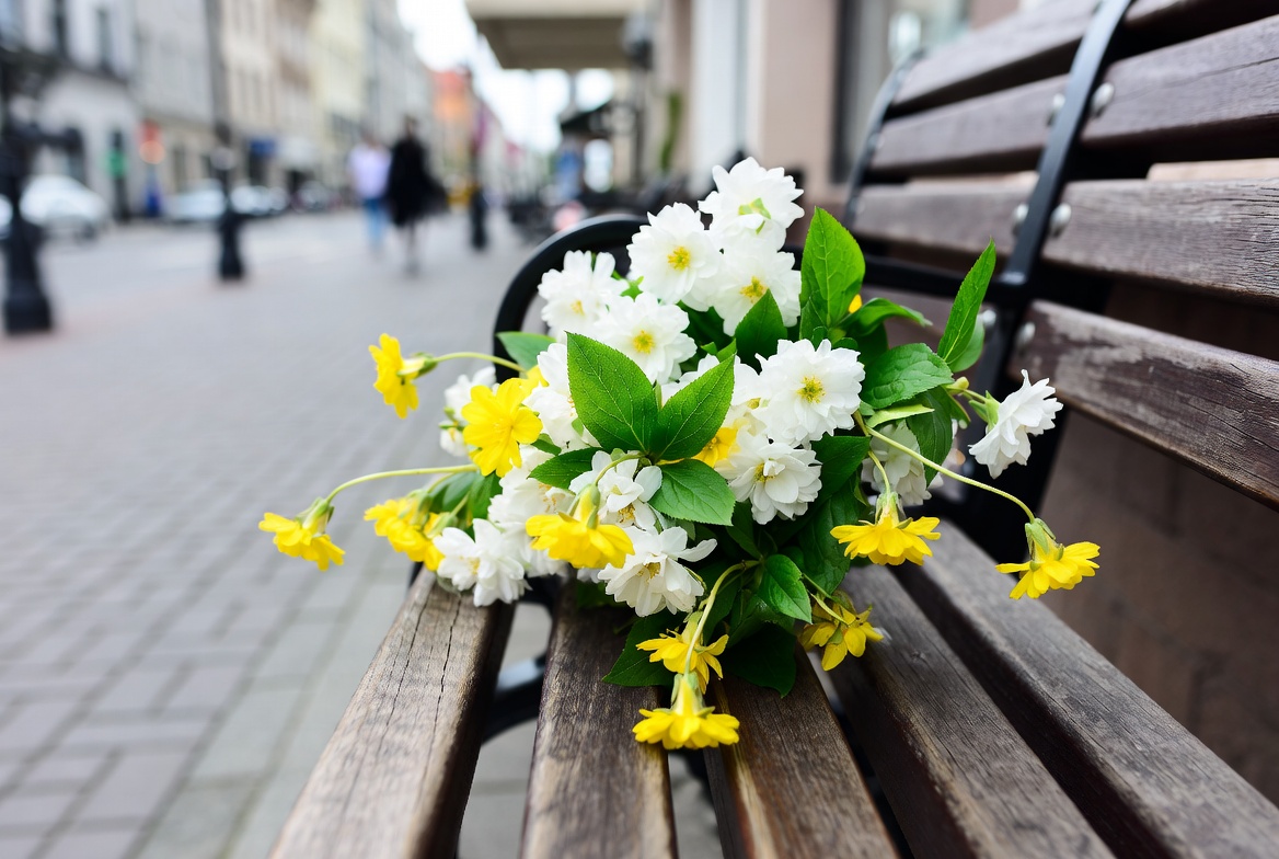 blurred background, bouquet, city park, city sidewalk, cobblestone, floral arrangement, flowers on bench, green leaves, outdoor, park bench, pedestrians, public bench, spring flowers, street scene, streetlights, urban street, white flowers, wooden bench, yellow flowers, daisies