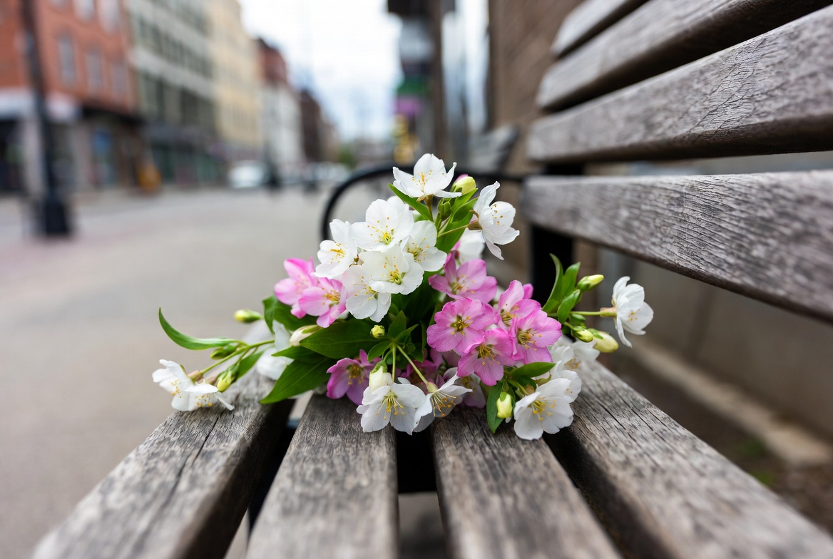 A bouquet of delicate pink and white flowers rests on a weathered wooden park bench. The bench is situated on a quiet urban street with blurred buildings and a sidewalk in the background. The flowers feature clusters of small blooms with green stems.