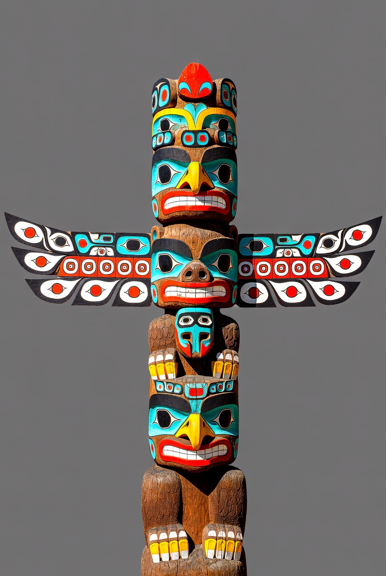 Indigenous, Native American, Pacific Northwest, art, black, blue, carving, colorful, cultural symbol, eagle, faces, isolated background, red, sculpture, stacked figures, three faces, traditional, wings, wood, yellow, totem pole