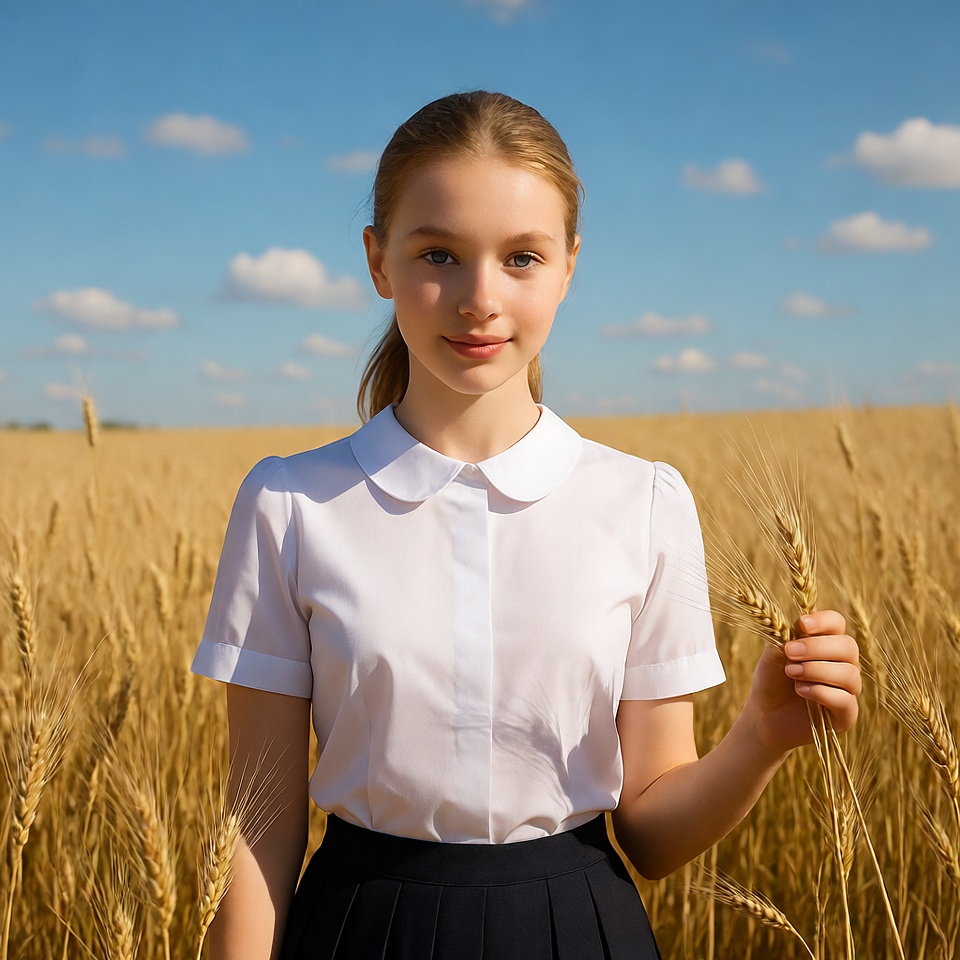 White, blonde hair, blue sky, clouds, collared shirt, female, field background, golden wheat, holding wheat, navy skirt, outdoor, pleated skirt, ponytail, portrait, short sleeves, smiling girl, summer, wheat field, wheat stalk, white blouse, young girl, girl