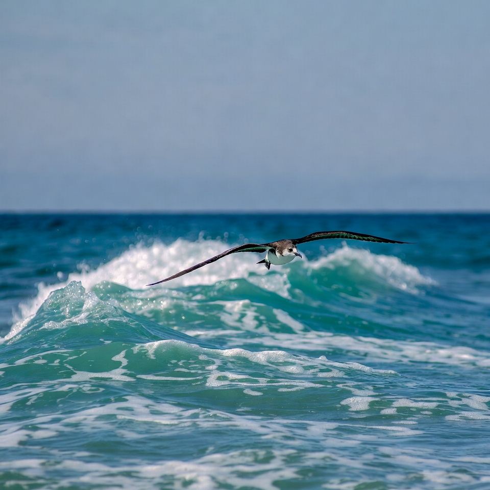 bird flying, blue sky, crashing waves, dark wings, flying bird, foam, gull, low flight, marine bird, nature, ocean bird, ocean waves, sea, shearwater, turquoise water, wave surf, white face, wildlife, wings spread, seabird