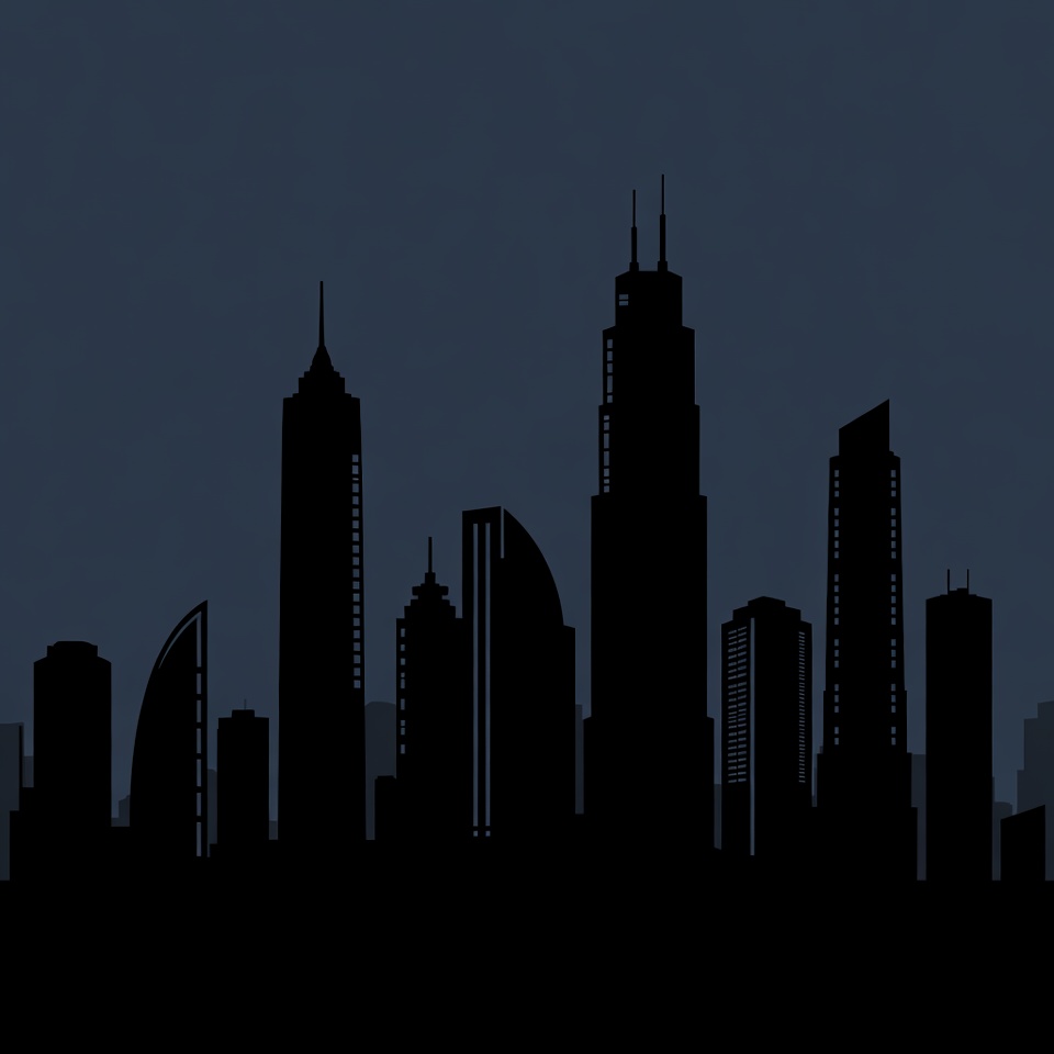 black silhouette, cityscape, dark background, gradient sky, high-rises, illustration, isolated background, modern architecture, night sky, silhouette, skyscrapers, tall buildings, towers, urban landscape, city skyline