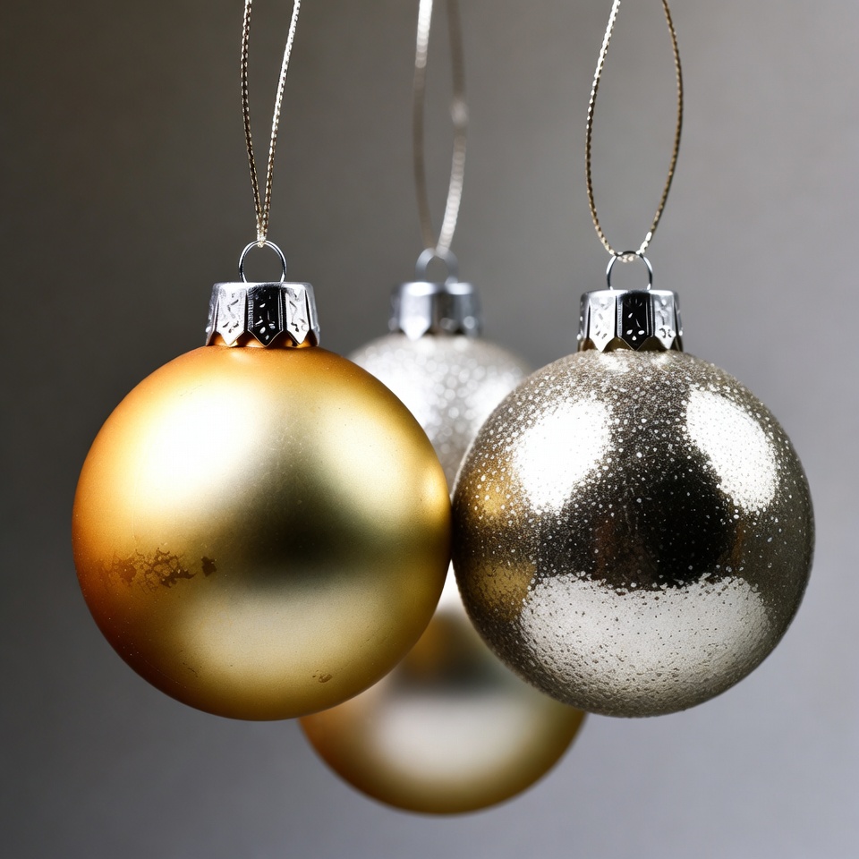 Christmas balls, baubles, festive decor, glossy finish, gold ornament, hanging ornaments, holiday decorations, holiday spheres, metallic gold, ornament cluster, shiny balls, silver bauble, sparkly silver, suspended baubles, three ornaments, Christmas ornaments