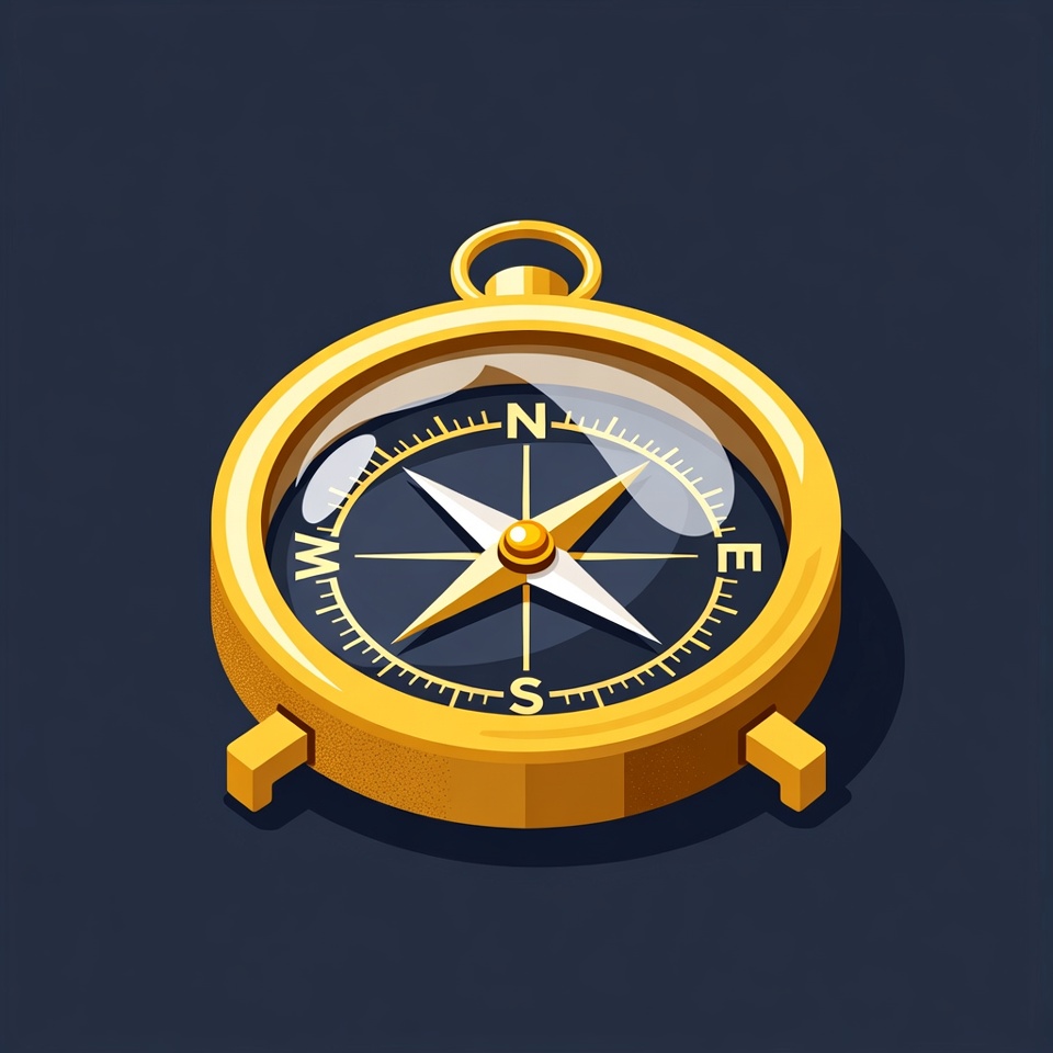 A detailed vector illustration of a golden pocket compass on a dark background. The compass features a clear glass cover over a black dial with white directional markings for North, South, East, and West. It has a metallic chain ring and subtle shadow for a 3D effect.