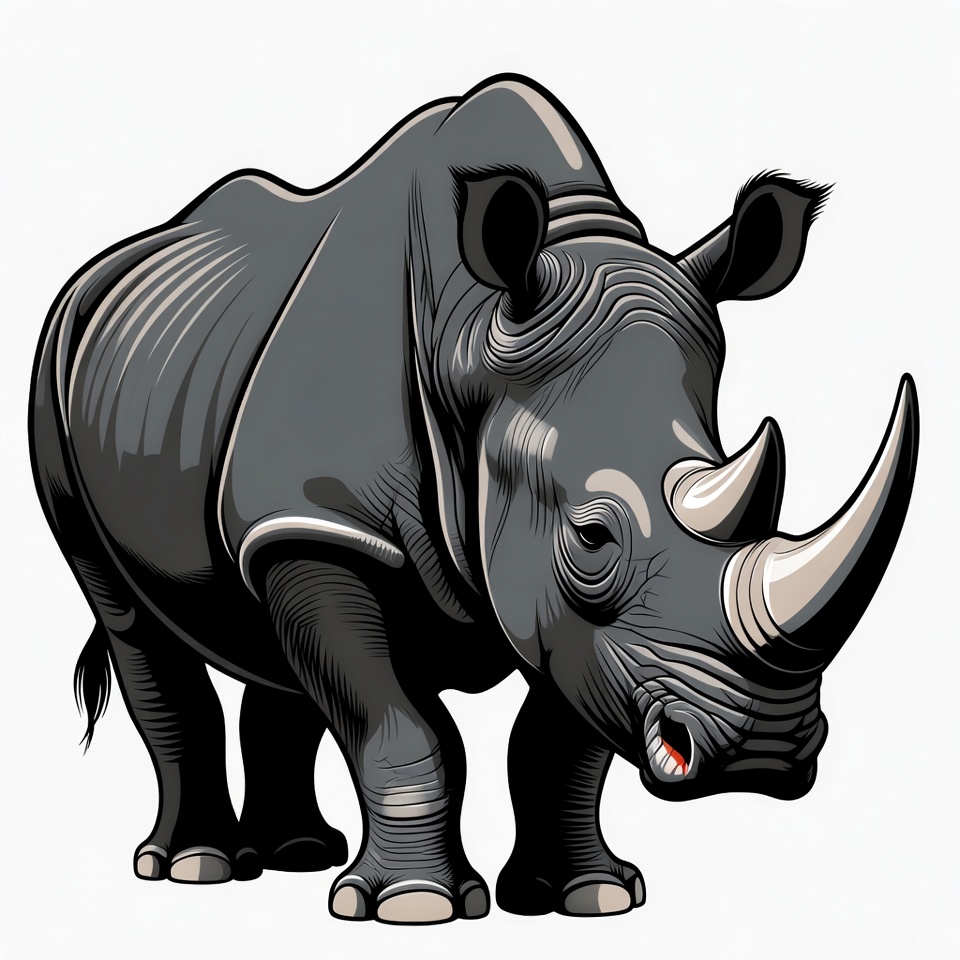 A detailed cartoon illustration of a black rhinoceros stands on a white background. The rhino features a prominent horn, muscular body, and expressive face with an open mouth. Bold black outlines and shading give it a dynamic, vector art style.