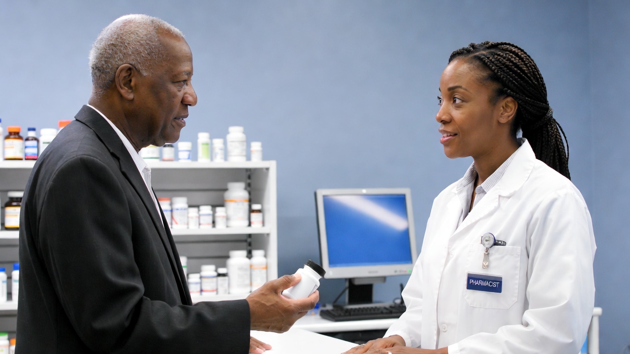 An elderly African-American man in a dark suit stands at a pharmacy counter, speaking with a smiling African-American woman wearing a white lab coat and name tag. She holds a prescription bottle while shelves of colorful medicine bottles line the blue walls behind the counter with a computer monitor. Both appear engaged in conversation at the pharmacy service desk.