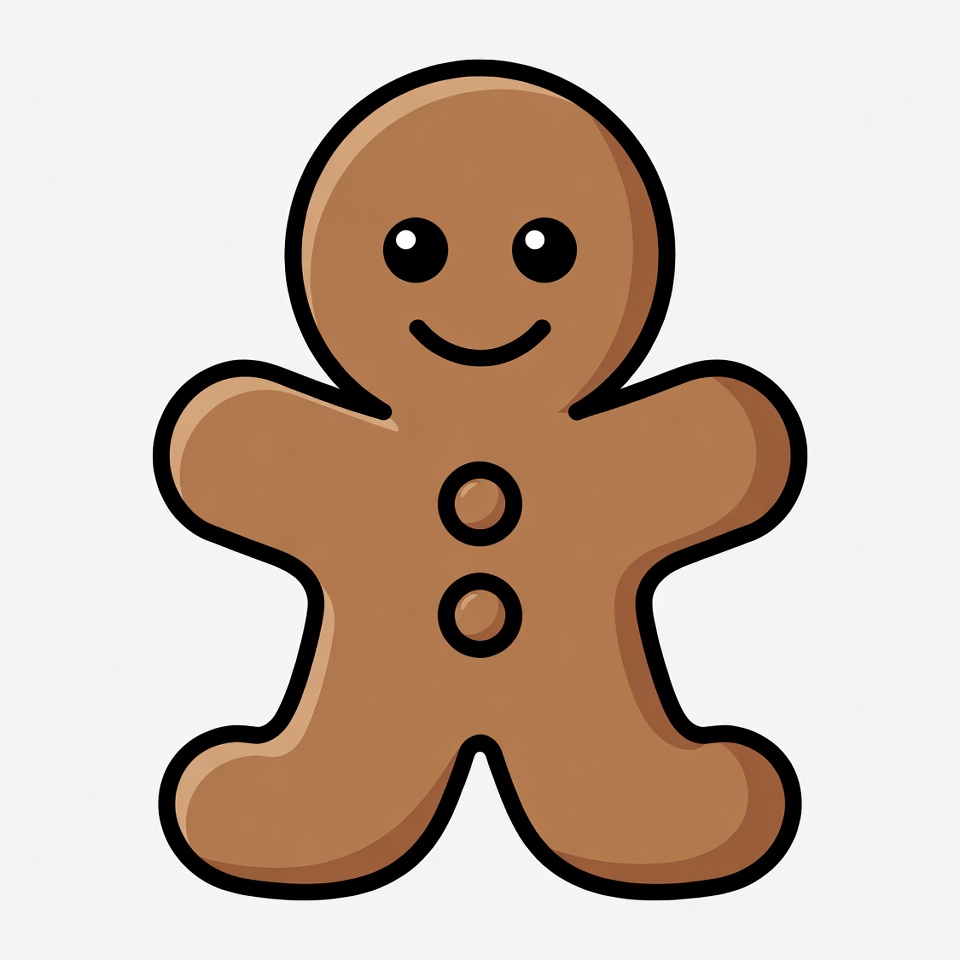 A cute cartoon gingerbread man stands with arms outstretched on a white background. It features a brown gingerbread body, big black eyes, a cheerful smile, and three white buttons on its torso. The illustration has bold black outlines and a simple, isolated design.