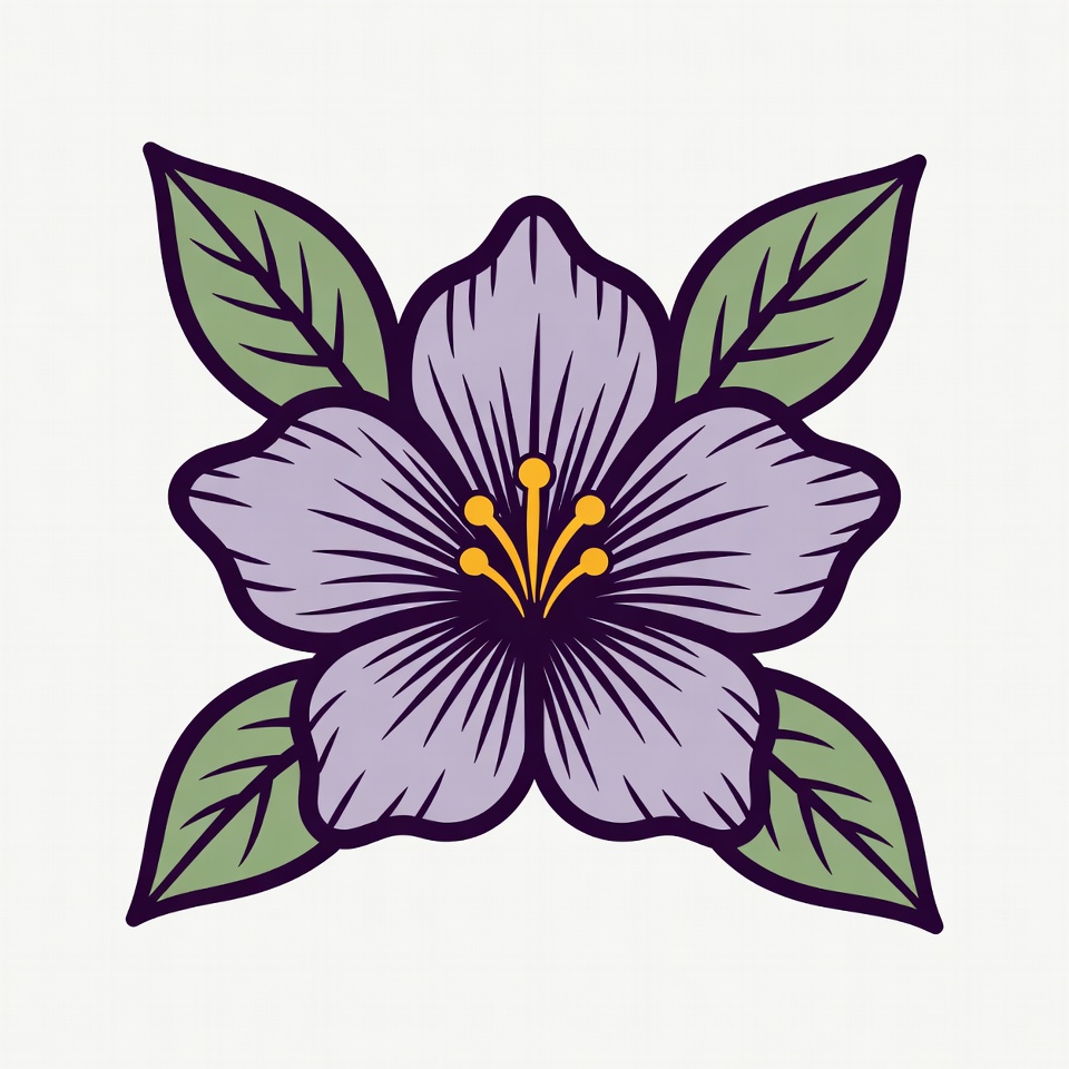 bloom, botany, clipart, floral, flower, flower art, graphic, green leaves, hand drawn, illustration, isolated background, lavender flower, leaf outline, leaves, nature, petals, simple flower, vector, yellow center, purple flower