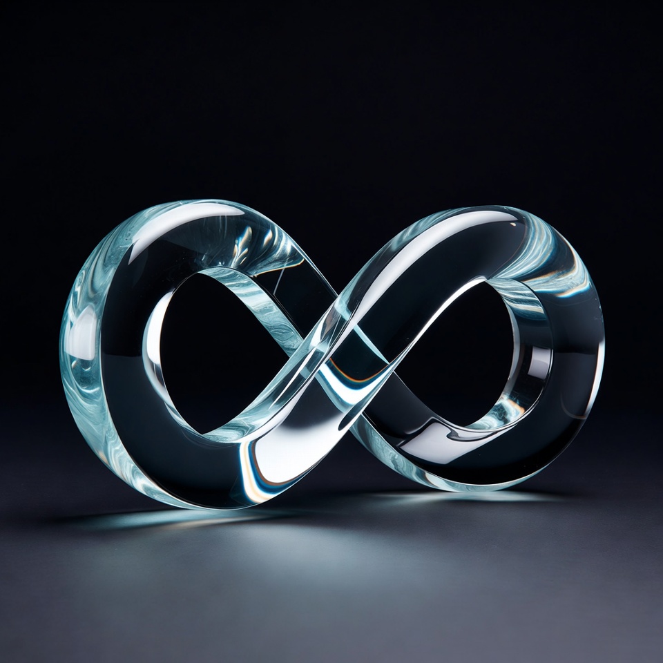 A transparent glass sculpture forms the infinity symbol with smooth, curved loops. It features subtle blue highlights and internal reflections against a dark background. The object is centered and isolated for emphasis.