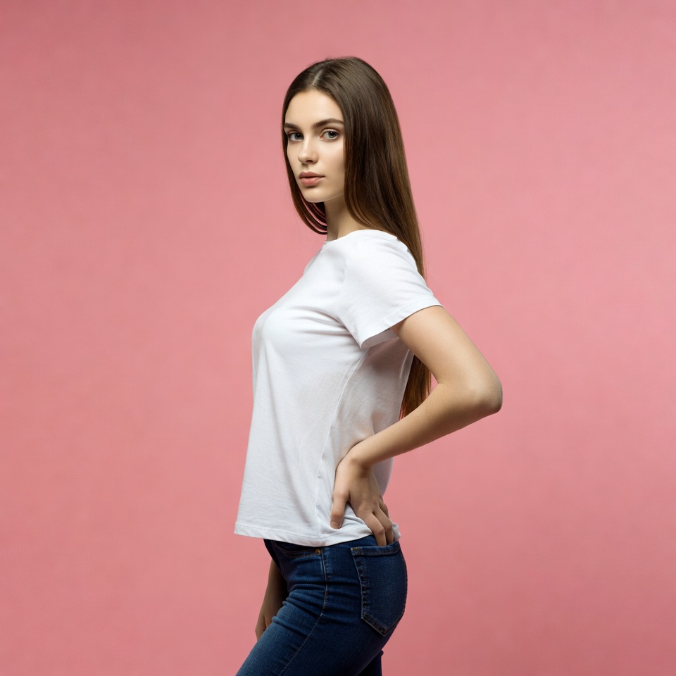 A young woman with long brown hair stands in profile against a pink background. She wears a fitted white t-shirt and tight blue jeans, with her hand on her hip. Her pose accentuates her figure from the side view.