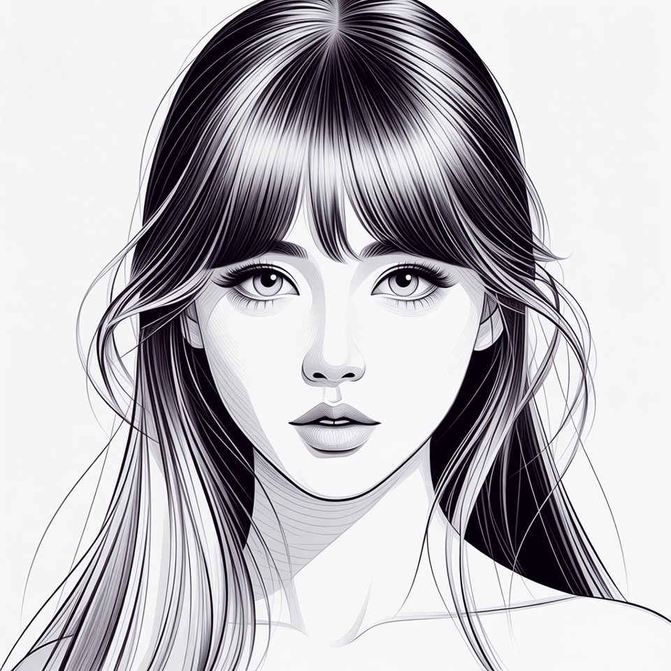 A detailed black and white illustration of a young Asian woman with long straight black hair and bangs. She has large expressive eyes and full lips, gazing forward with a subtle smile. The portrait features fine line art shading on an isolated white background.