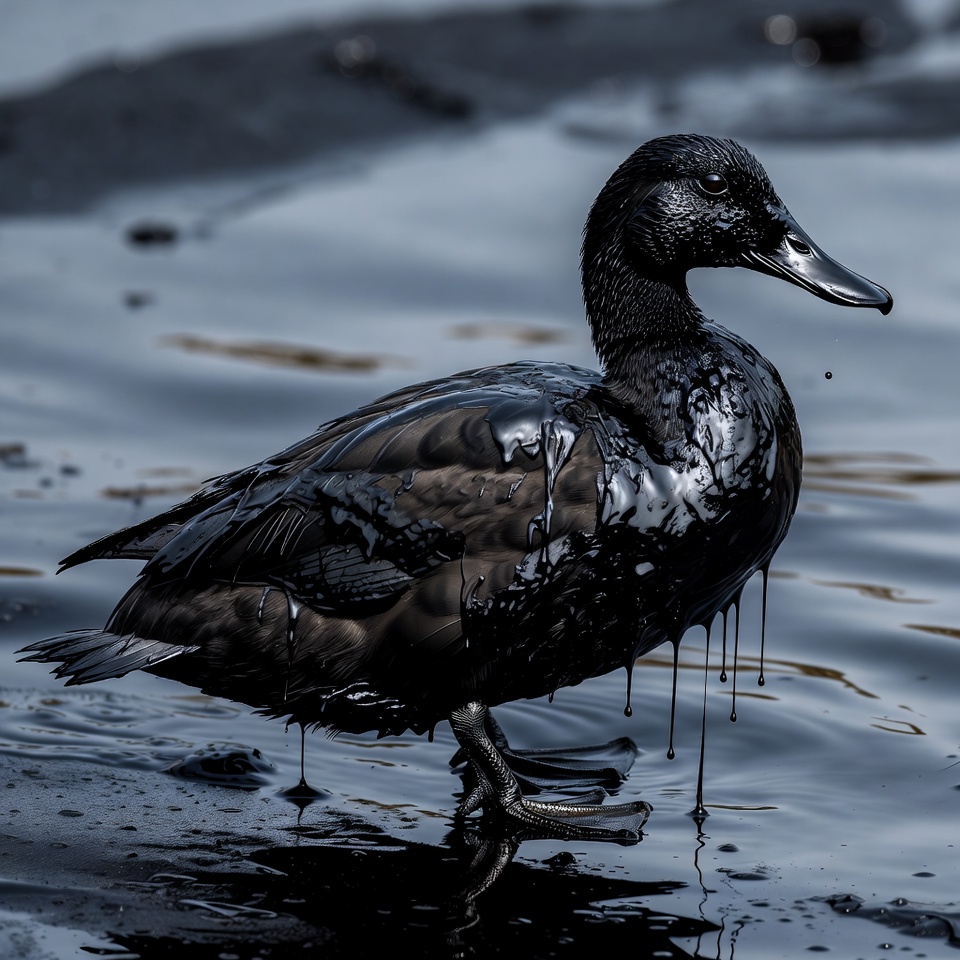 bird, black oil, contaminated bird, dripping oil, environmental disaster, feathers, glossy oil, oil spill, oil-covered duck, oily feathers, pollution, shallow water, water, wildlife, duck
