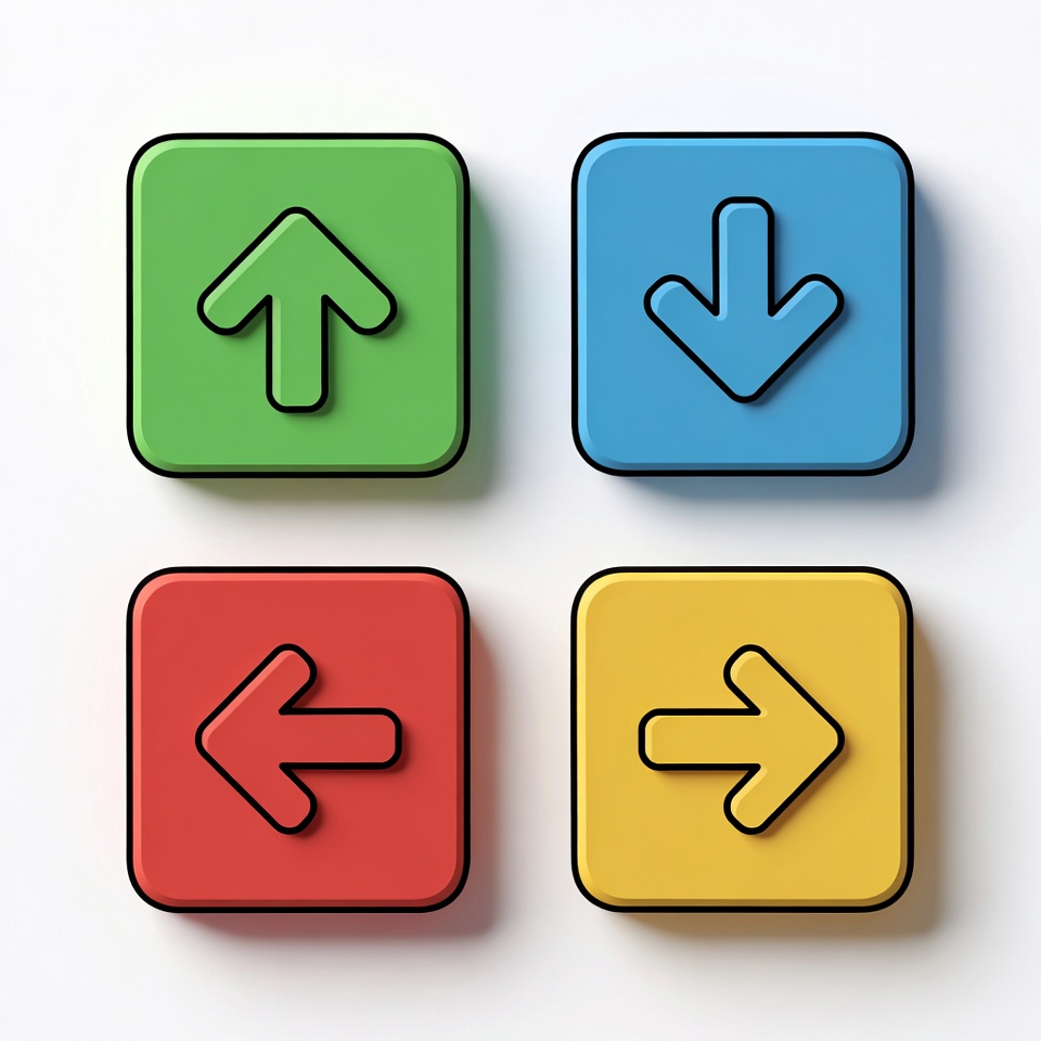 Four square buttons in green, blue, red, and yellow feature directional arrows. The green button has an up arrow, blue has a down arrow, red has a left arrow, and yellow has a right arrow. They are arranged in a 2x2 grid on a white background.