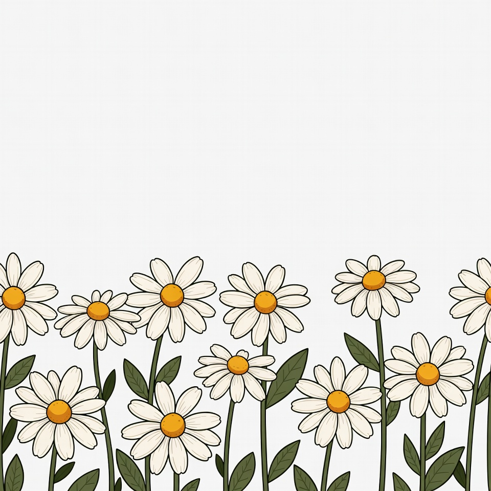 A row of white daisy flowers with yellow centers and green leaves stands against a plain white background. The illustration features multiple daisies arranged in a horizontal line. Each daisy has detailed petals and stems.