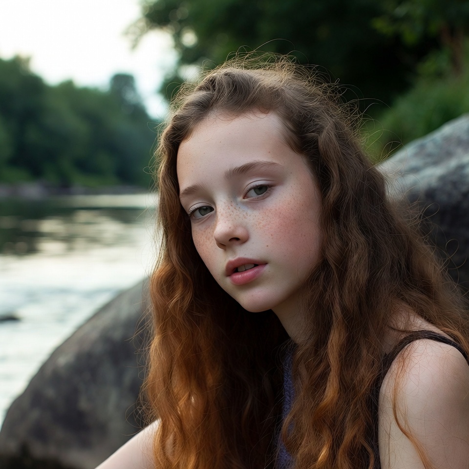A young girl with long wavy red hair sits on large rocks by a calm river. She wears a gray tank top and gazes slightly to the side with freckles on her face. Lush green trees and water form the background.