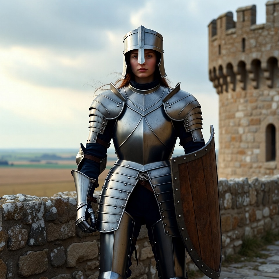 A young woman dressed as a medieval knight stands confidently in full silver plate armor and helmet. She holds a wooden shield in one hand and wears leather gloves and boots. She poses in front of a stone castle wall on a cloudy day with fields in the background.