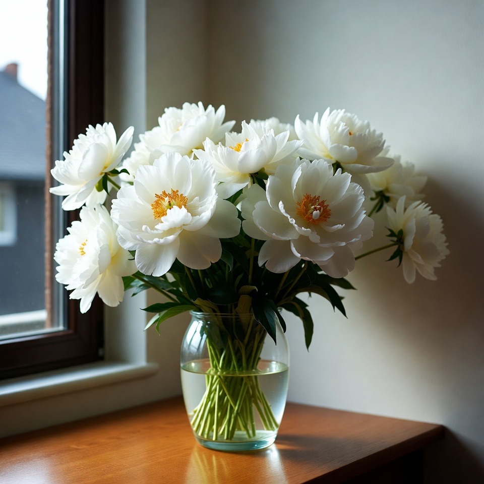 blooming peonies, bouquet vase, close-up flowers, elegant flowers, floral display, flower arrangement, flower vase, fresh peonies, glass vase, green stems, home decor, indoor flowers, peony bouquet, peony flowers, white flowers, window view, wooden table, yellow centers, white peonies