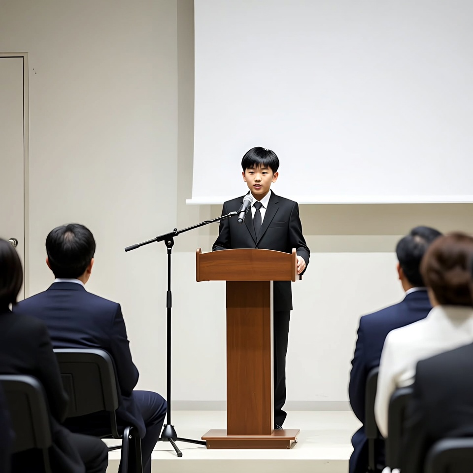 A young Asian boy in a black suit stands at a wooden podium delivering a speech into a microphone. A group of Asian adults in business suits sits attentively in chairs behind him in a conference room with a white projector screen on the wall. The setting features a simple beige interior with a microphone stand.