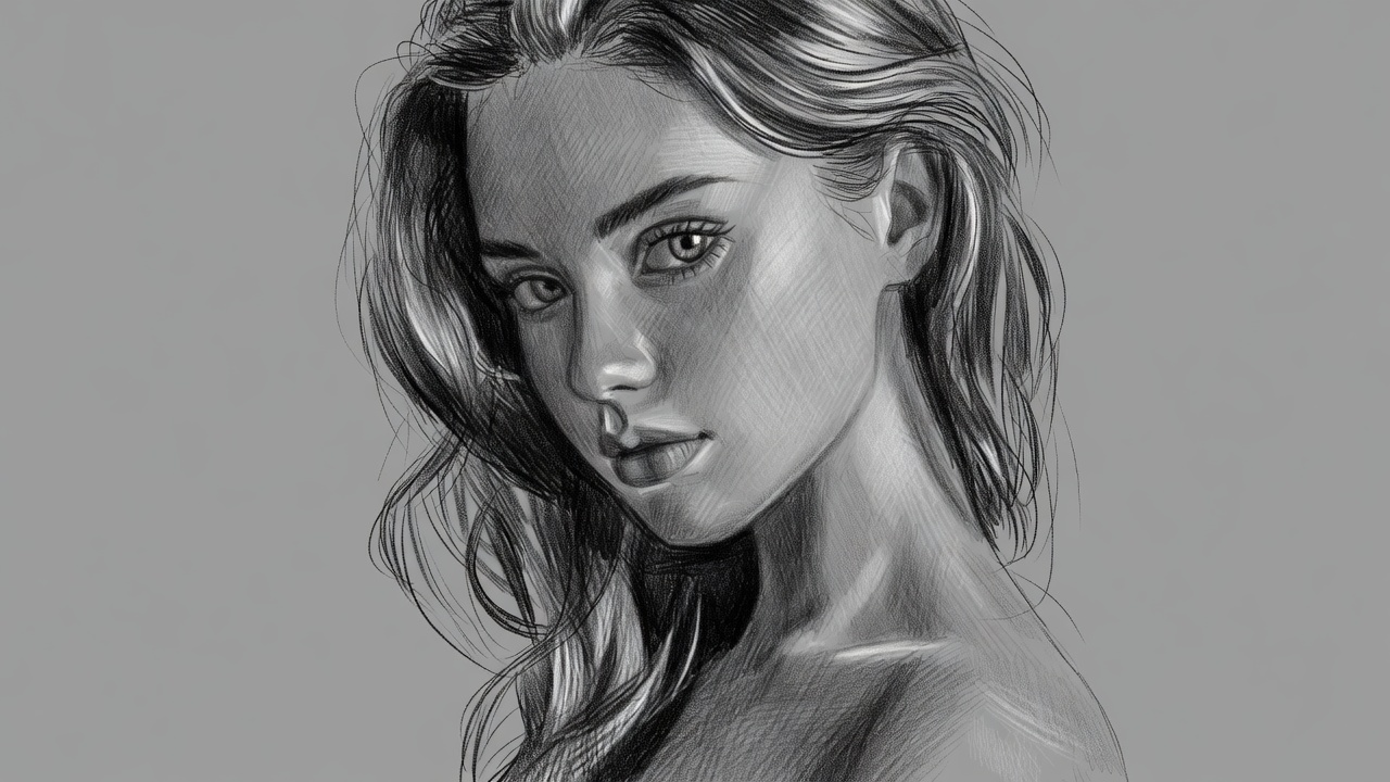 White, artistic drawing, blonde hair, detailed sketch, drawing, eyes, face, female, grayscale, illustration, lips, pencil sketch, portrait, shoulders, side gaze, wavy hair, young woman, woman