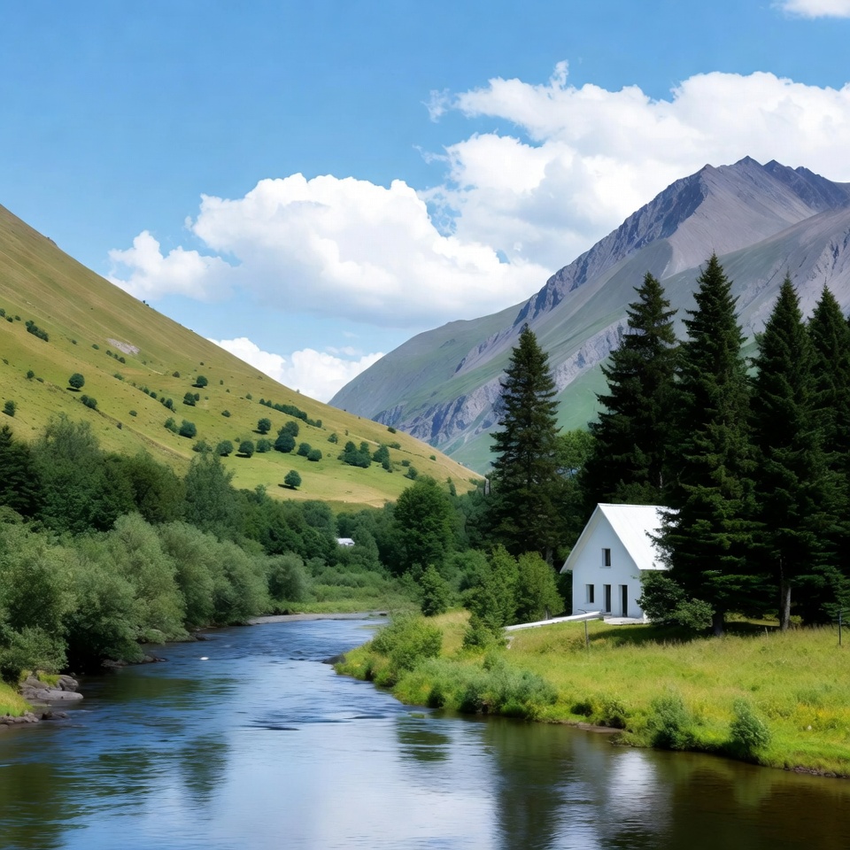A small white cabin sits beside a clear river flowing through a lush green valley. Snow-capped mountains rise in the background under a partly cloudy blue sky. Evergreen trees and grassy hills surround the serene alpine landscape.