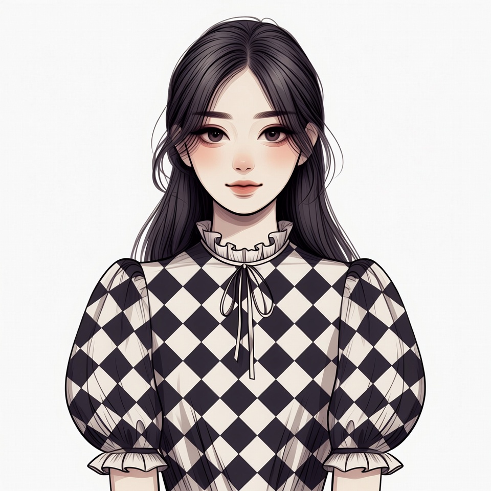 An anime-style illustration of a young Asian woman with long straight black hair and subtle makeup. She wears a black and white checkered blouse with puffed sleeves, ruffled collar, and bow tie. She faces forward against a plain white background.