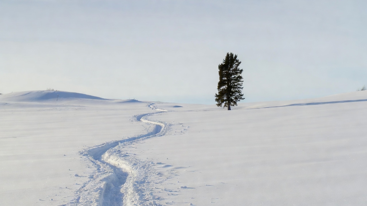 A single tall pine tree stands in a vast snowy landscape with a winding trail of footprints leading toward it. Snow-covered hills rise gently in the background under a pale blue sky. The scene features pristine white snow and isolated natural beauty.