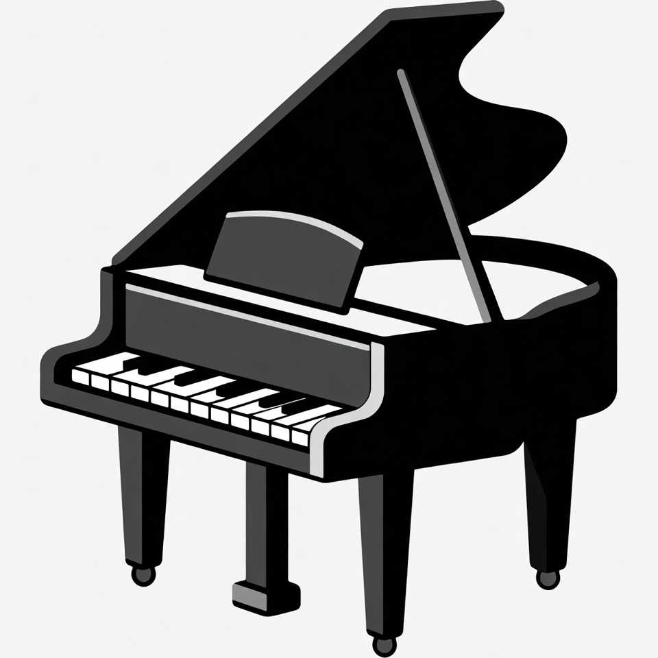 black piano, cartoon piano, clipart, elegant piano, illustration, isolated background, music stand, musical instrument, open lid, piano, piano keys, vector piano, white keys, grand piano