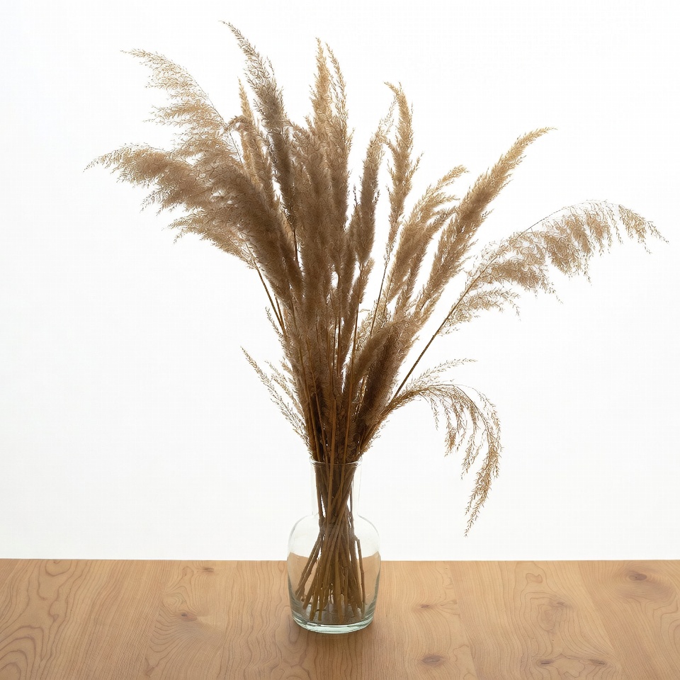 A bouquet of tall, fluffy pampas grass in beige tones stands in a clear glass vase. The vase is placed on a wooden table with a white background. The grass plumes fan out elegantly from the vase.