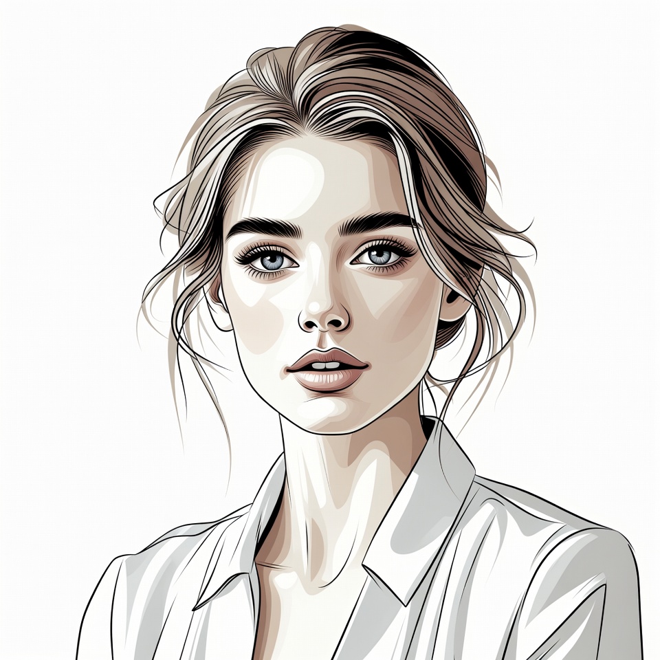 White, beautiful, blue eyes, closeup, collared shirt, digital illustration, face, female, hairstyle, illustration, isolated background, light brown hair, loose bun, ponytail, portrait, white shirt, young woman, woman