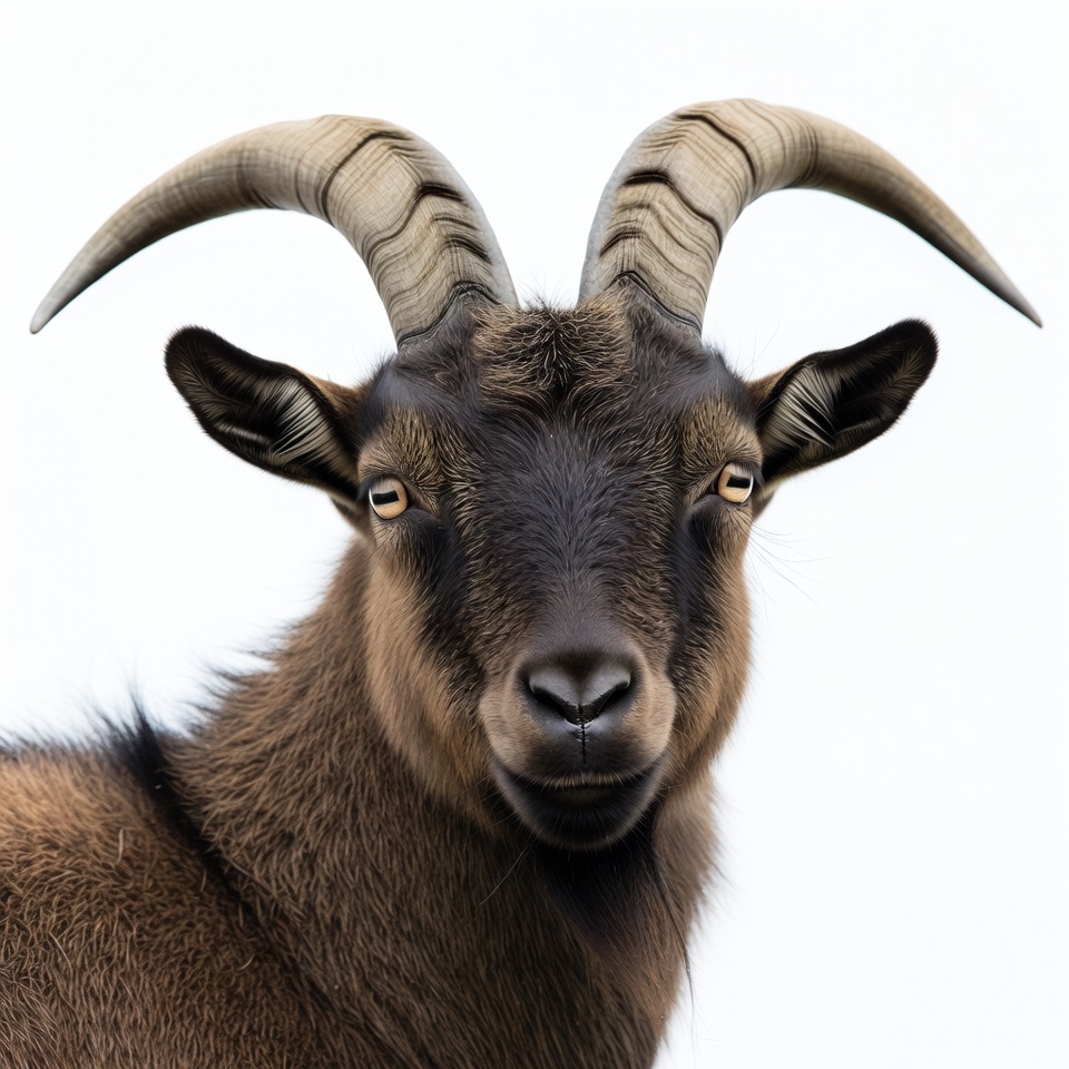 animal portrait, billy goat, brown goat, closeup, curved horns, farm animal, furry, headshot, horns, isolated, livestock, mammal, white background, yellow eyes, goat