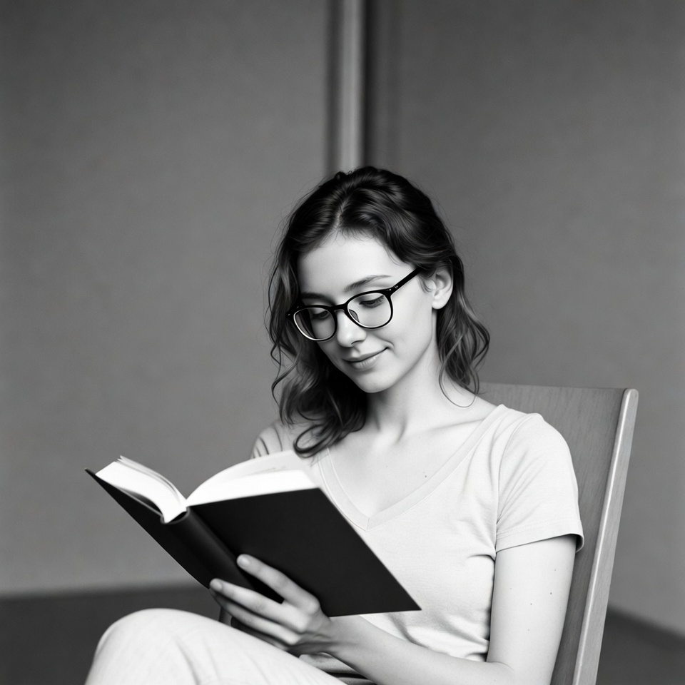 A young woman with wavy hair and glasses sits in a wooden chair reading a thick open book. She wears a light-colored t-shirt and relaxed pants, holding the book with both hands. The image is in black and white with a plain background.