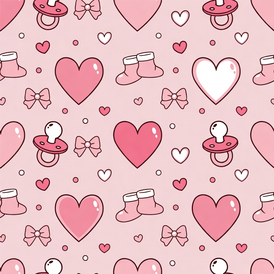 A seamless pink cartoon pattern features scattered baby pacifiers with bows, tiny baby boots, and pink and white hearts. The elements are illustrated in a cute kawaii style on a light pink background. It is designed for baby shower or nursery decorations.