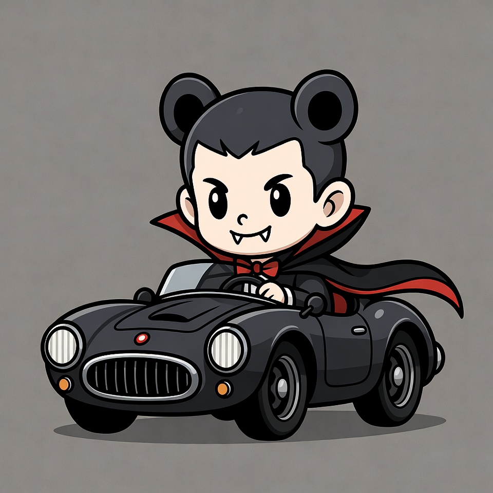 A chibi-style cartoon vampire with black hair, bunny ears, and red cape sits in the driver's seat of a black sports car. He has sharp fangs, wide eyes, and grips the steering wheel while driving. The illustration features a gray background with bold outlines and vibrant red accents on the cape.