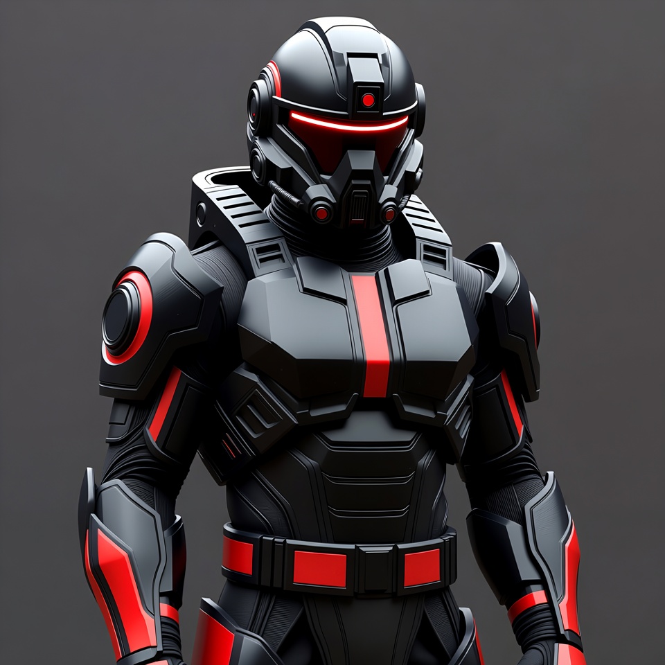 3D render, angular design, armored soldier, backpack, black armor, cyberpunk, dark background, digital art, exo suit, full body, futuristic armor, glowing visor, helmet, illustration, isolated, military armor, power armor, red accents, red lights, sci-fi character, shoulder pads, space marine, standing pose, warrior, sci-fi soldier