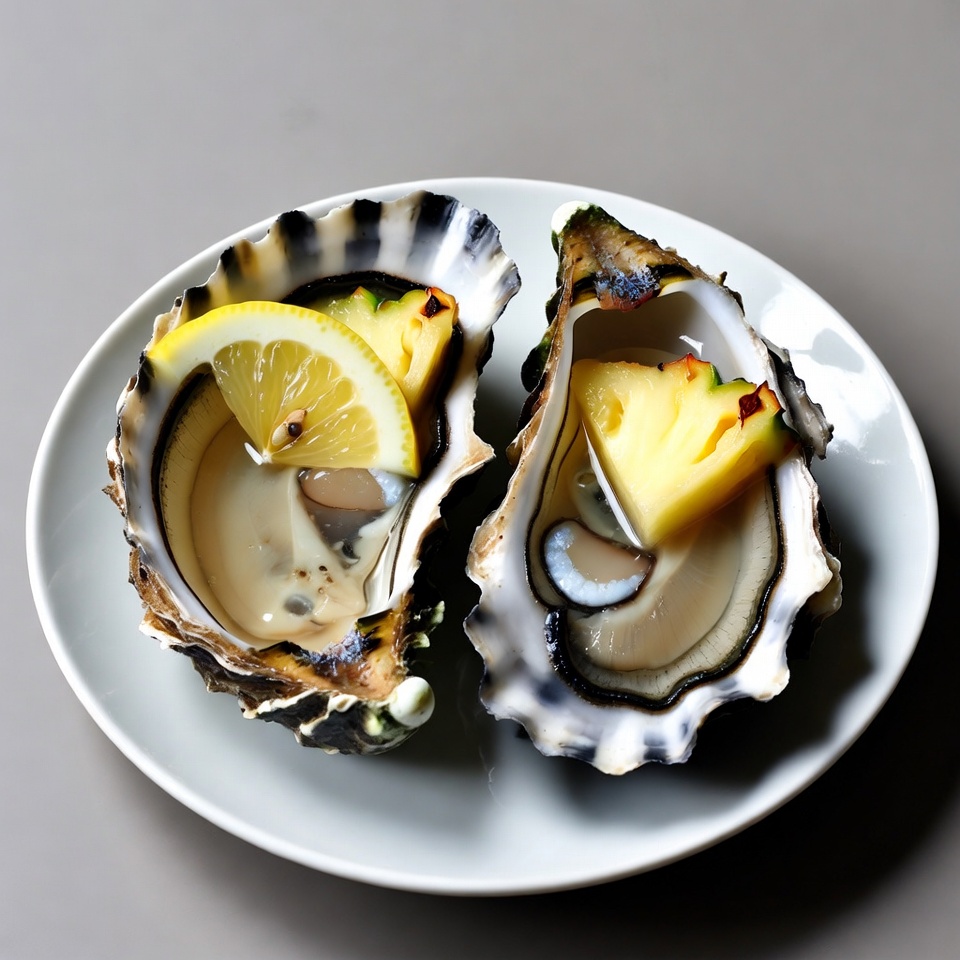 Two fresh oysters on the half shell are garnished with lemon wedges and pineapple chunks. They sit on a white plate against a gray background. The shells show dark charred edges and pearly interiors with visible oyster meat.