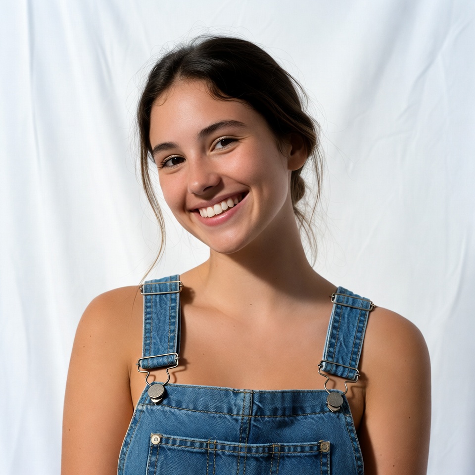 A young woman with brown hair pulled into a bun smiles warmly at the camera. She wears sleeveless blue denim overalls with straps over her shoulders. She stands against a plain white background.