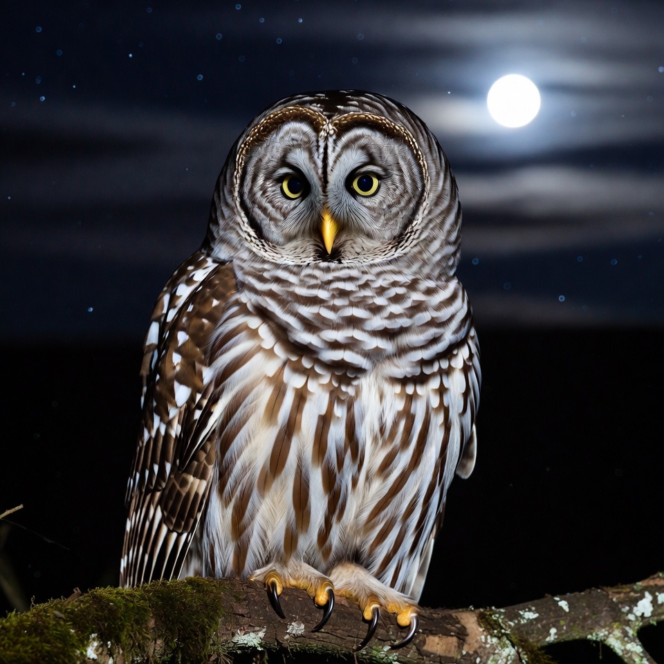 A barred owl with distinctive striped feathers sits on a moss-covered branch at night. Its yellow eyes gaze forward against a starry sky and full moon background. The owl's talons grip the branch firmly.