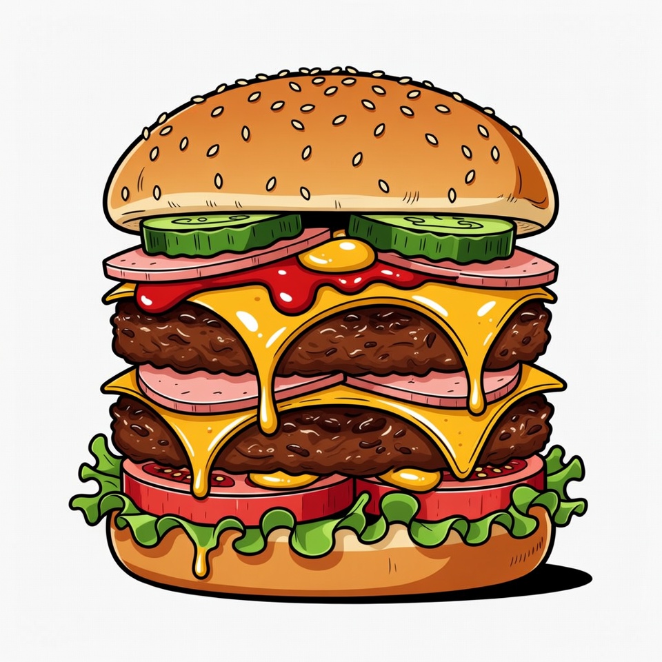 beef patty, burger art, cheeseburger, clipart, doodle burger, double burger, fast food, food illustration, fun food, gourmet burger, ham, hamburger, isolated background, juicy burger, ketchup, lettuce, melted cheese, pickles, sesame bun, stacked burger, tasty burger, tomato, vector burger, cartoon burger
