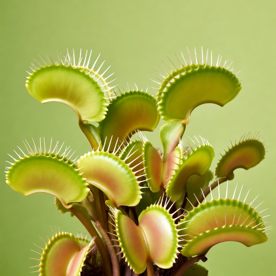 A cluster of vibrant green Venus flytrap plants features multiple open traps with sharp white spines. The carnivorous plants are arranged closely together against a solid light green background. Each trap shows reddish-pink interiors and sturdy stems.