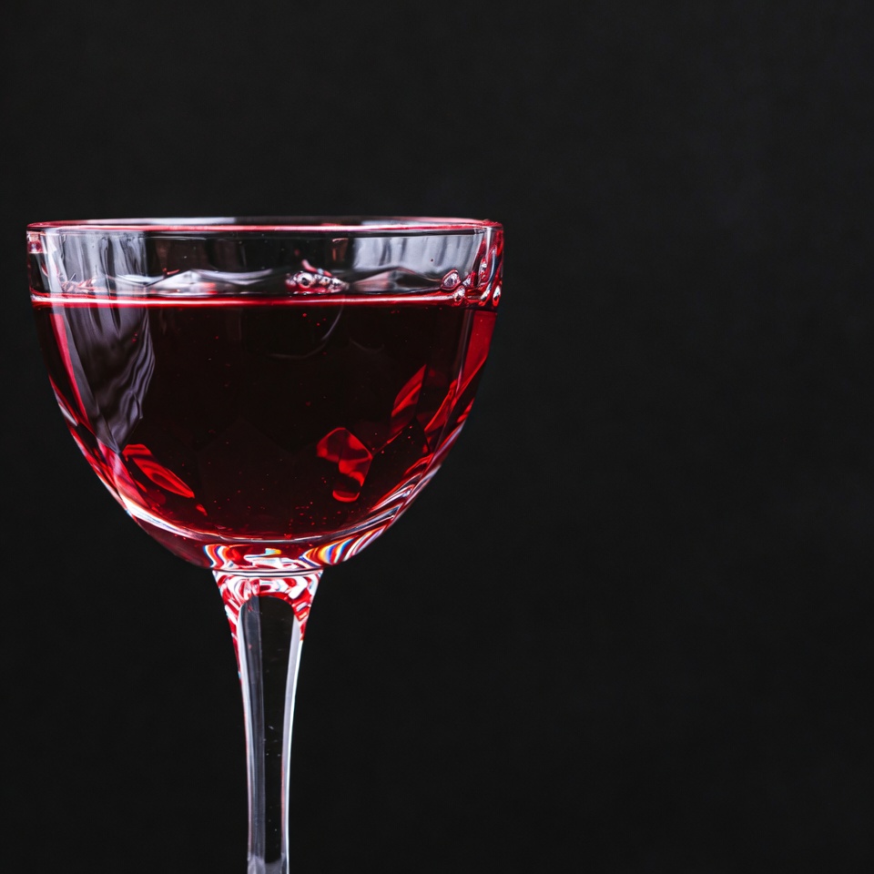 alcohol, beverage, black background, bubbles, cocktail, coupe glass, crystal glass, drink, elegant, isolated, red liquid, stemware, studio shot, wine glass, red wine