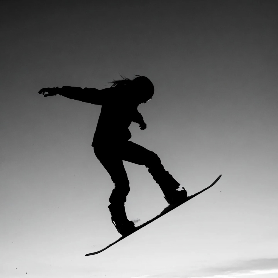 A black and white silhouette captures a woman mid-air performing a jump on a snowboard. She wears a jacket, pants, and boots, with long hair flowing behind her. Her arms are extended for balance against a plain background.