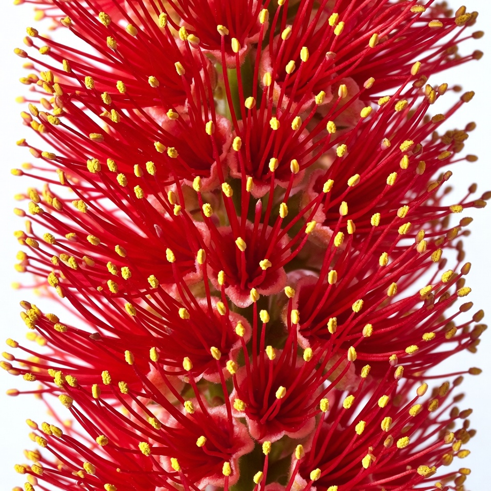 bloom, botany, callistemon, floral, flower closeup, flowering plant, fluffy flower, garden plant, green leaves, isolated background, macro photography, nature, pollen, red flower, red stamens, spike flower, stamen, vibrant red, yellow tips, bottlebrush flower