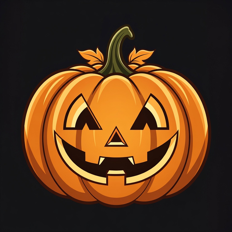 A vibrant orange jack-o'-lantern pumpkin with carved triangular eyes, nose, and jagged smiling mouth is depicted in a cartoon style. It features a green stem with leaves on top and is set against a solid black background. The illustration has bold black outlines and glossy highlights for a festive Halloween look.