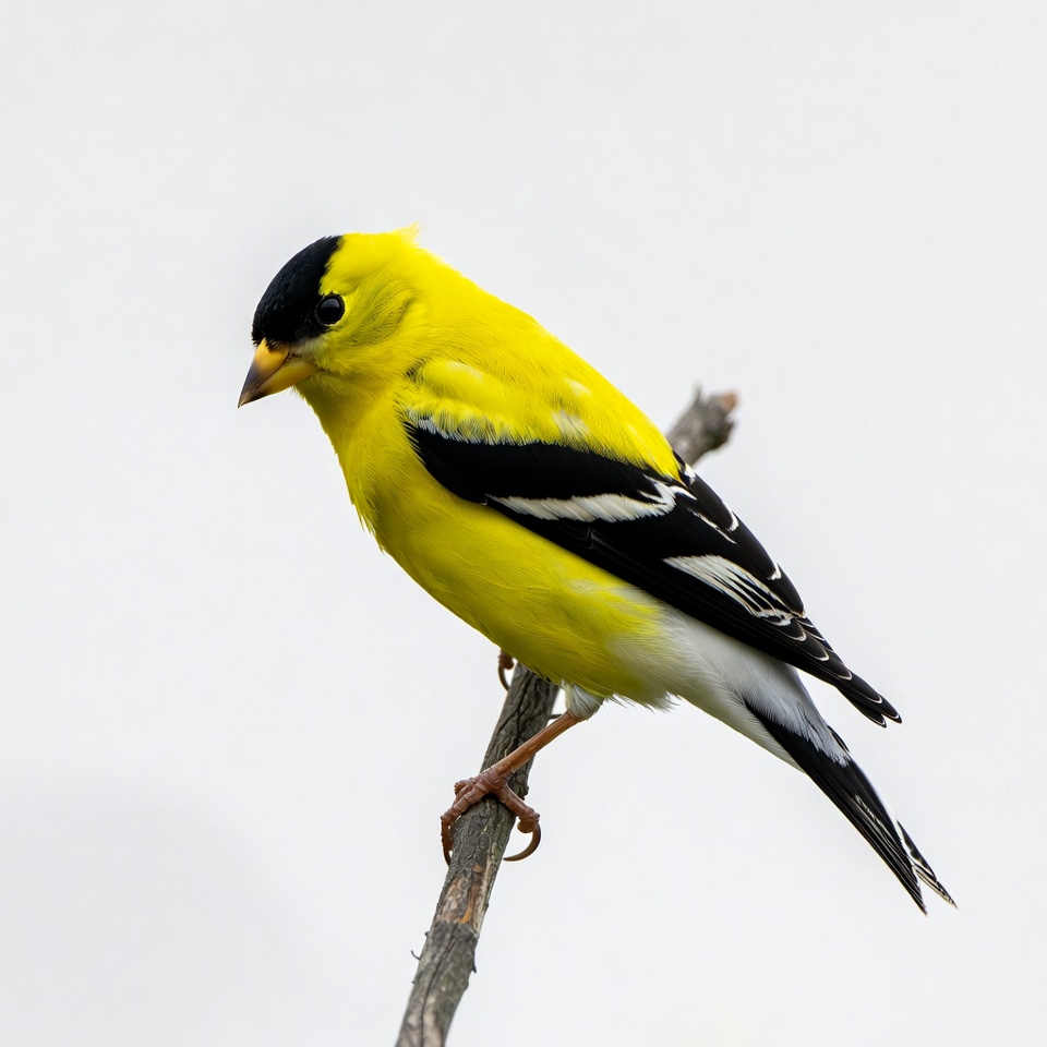American goldfinch, bird, black cap, branch, feathers, finch, isolated background, nature, orange beak, perched, songbird, white wings, wildlife, yellow bird, goldfinch
