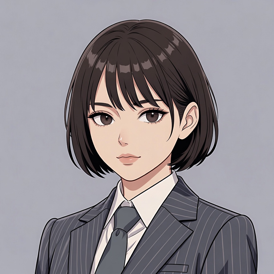 Asian, bangs, black hair, bob haircut, business attire, closeup, dark tie, female, gray suit, illustration, isolated background, manga style, necktie, pinstripe suit, portrait, suit jacket, white shirt, young woman, anime girl