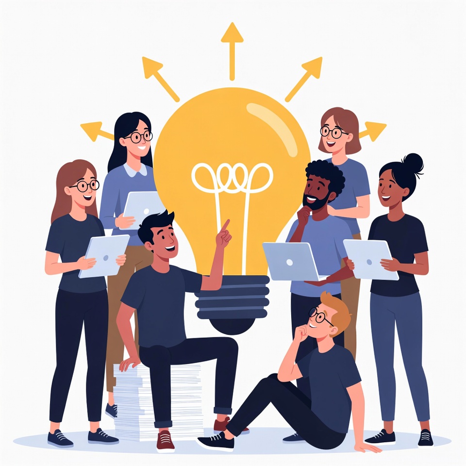 A diverse group of six professionals, including men and women of White, African-American, and Asian ethnicities, collaborates around a large glowing yellow lightbulb symbolizing ideas. They hold laptops and tablets, with one man pointing at the bulb and another sitting on the floor surrounded by stacked papers. The illustration features upward arrows radiating from the central lightbulb on an isolated white background.