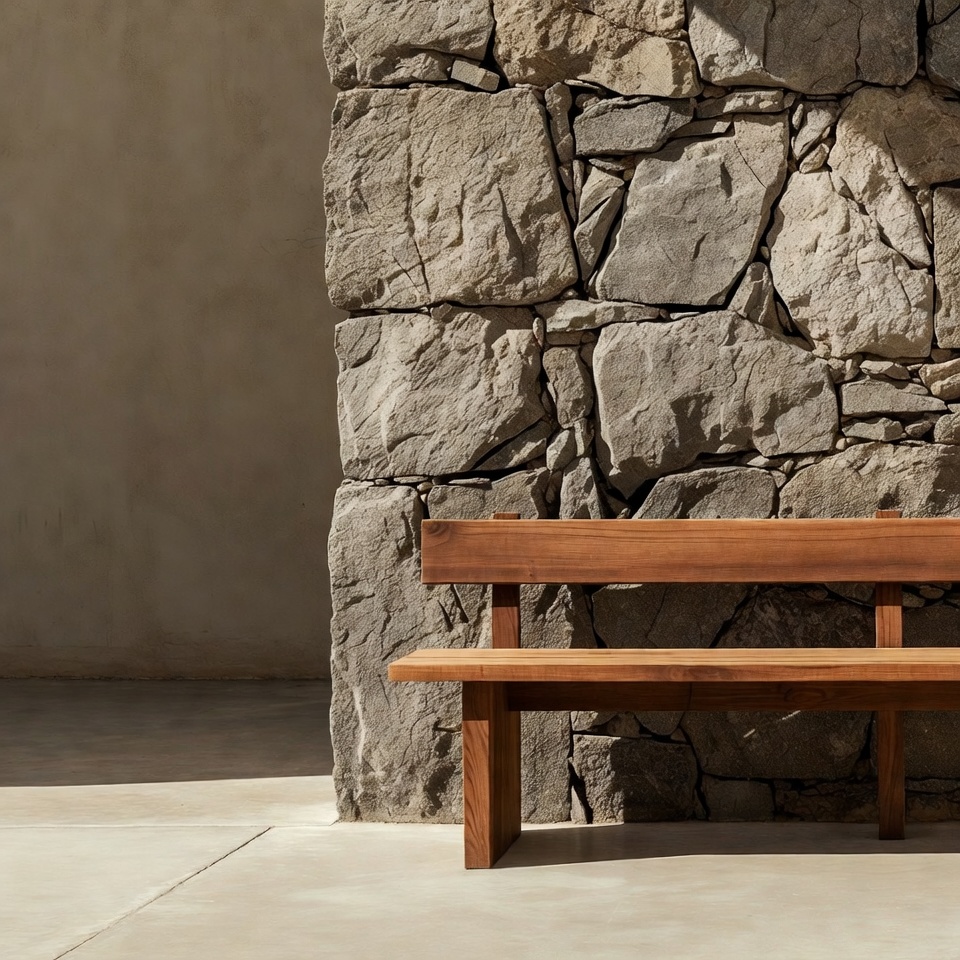 architecture, bench, concrete floor, garden bench, isolated background, minimalist, natural wood, outdoor bench, rock wall, rustic, shadows, stone wall, sunlight, texture, wooden bench