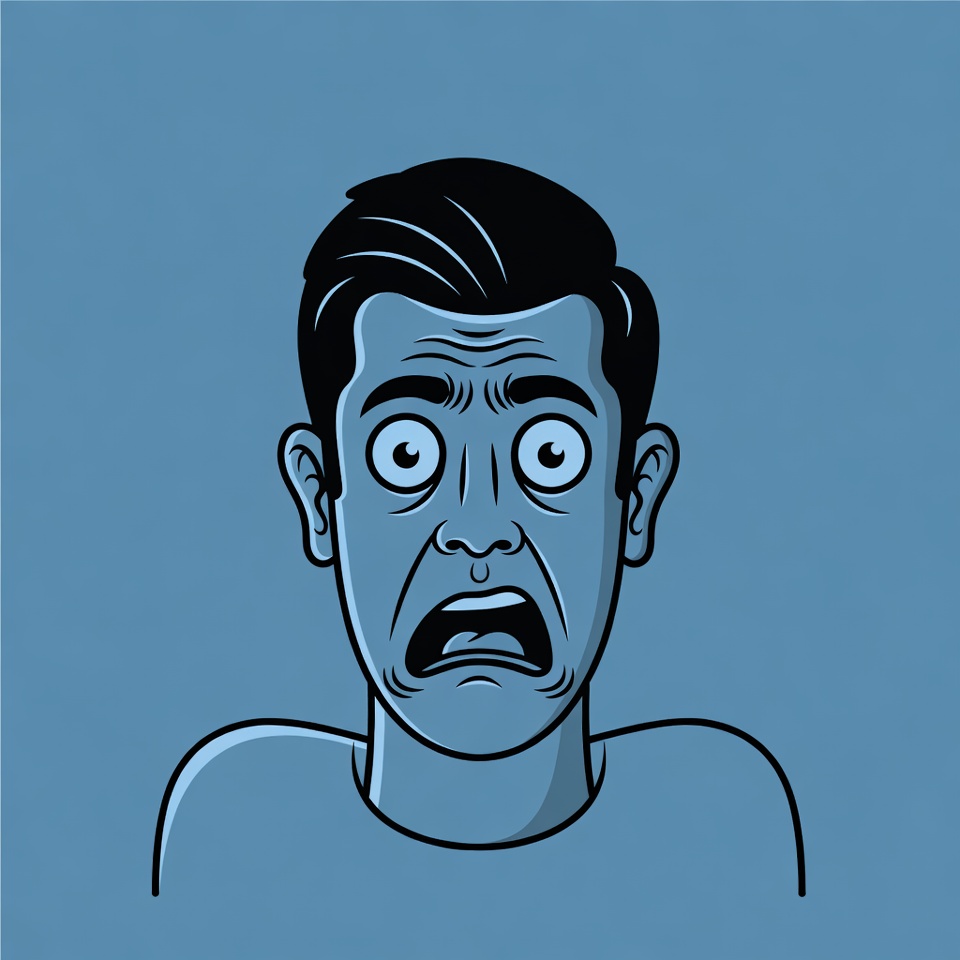 A cartoon illustration of a man with wide-open eyes and a large open mouth showing shock. He has short black hair, prominent eyebrows, and wears a simple collar shirt. The image features bold black outlines on a solid blue background.