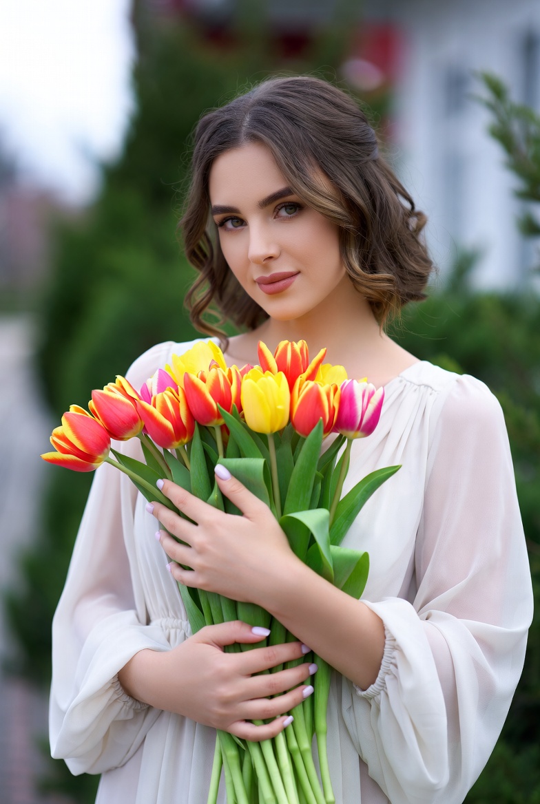A young woman with wavy brown hair holds a vibrant bouquet of multicolored tulips, including red, yellow, and pink flowers. She wears a sheer white long-sleeved dress and stands in front of green trees and a building. Her expression is gentle as she gazes at the camera.