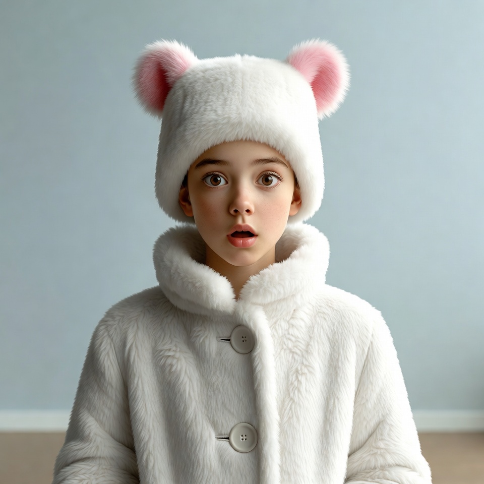 A young girl with large expressive eyes stands wearing a fluffy white coat with pink bear ears on the hood. The coat features a fur collar and buttons down the front. She poses against a plain light blue background.